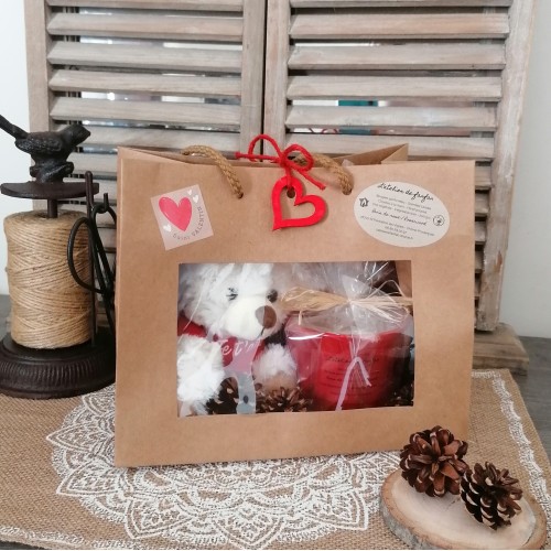 Le coffret évèvement Saint Valentin contient une bougie parfumée dans son contenant rouge verni, ainsi qu'une peluche Nournours de qualité pronant le message "Je t'aime" sur son tee shirt rouge.